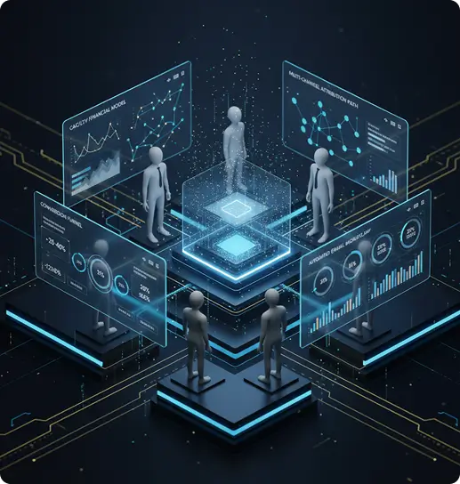 Live dashboards show multi-touch attribution, cohort analysis, and channel-specific ROAS. Weekly reports highlight what's working, what's not, and exactly where your budget goes. Custom KPIs based on your unit economics. Timeline: Ongoing.