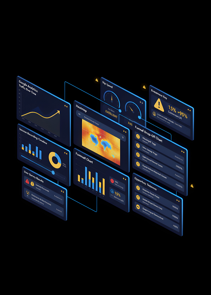 We start by understanding your business goals and conducting a comprehensive audit. Using analytics, heatmaps, and user recordings, we identify conversion bottlenecks and quick wins. This includes analyzing your conversion funnel, user flows, and key performance metrics.. Timeline: 3-5 business days.