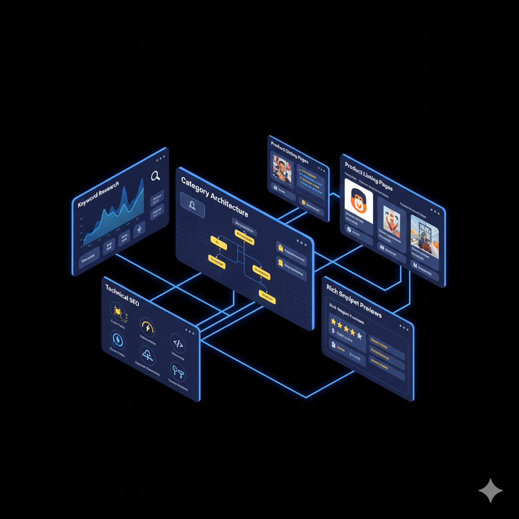 Developing your keyword matrix for products and categories, implementing comprehensive schema markup, setting up Google Merchant Center integration, and creating your content optimization roadmap. Timeline: 1-2 weeks.