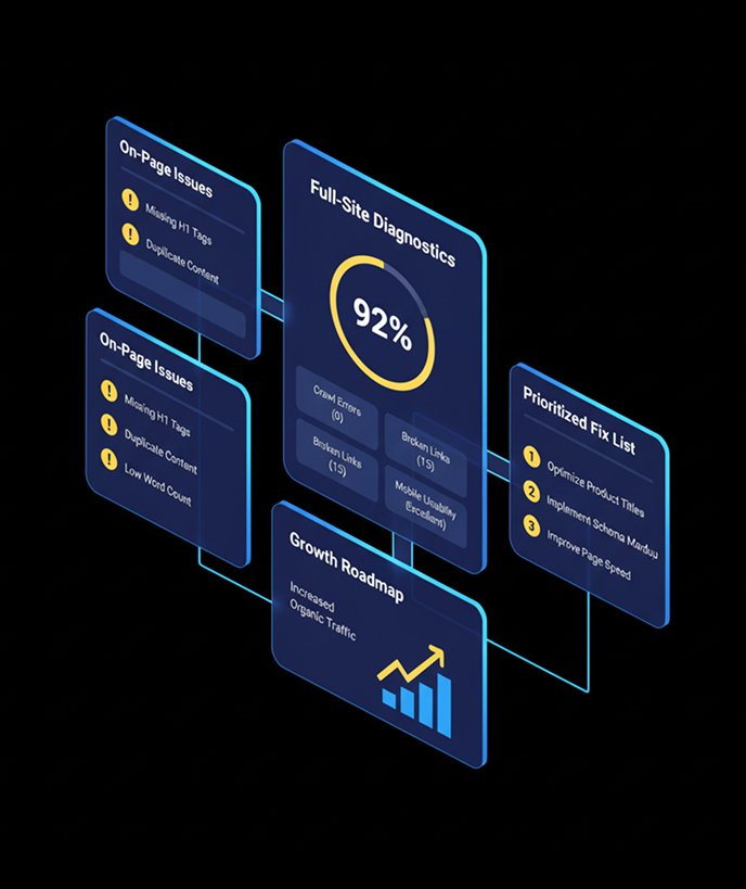 We analyze your current platform setup, product catalog structure, technical health, and competitor landscape. Identifying quick wins and growth opportunities specific to your ecommerce platform. Timeline: 3-5 business days.